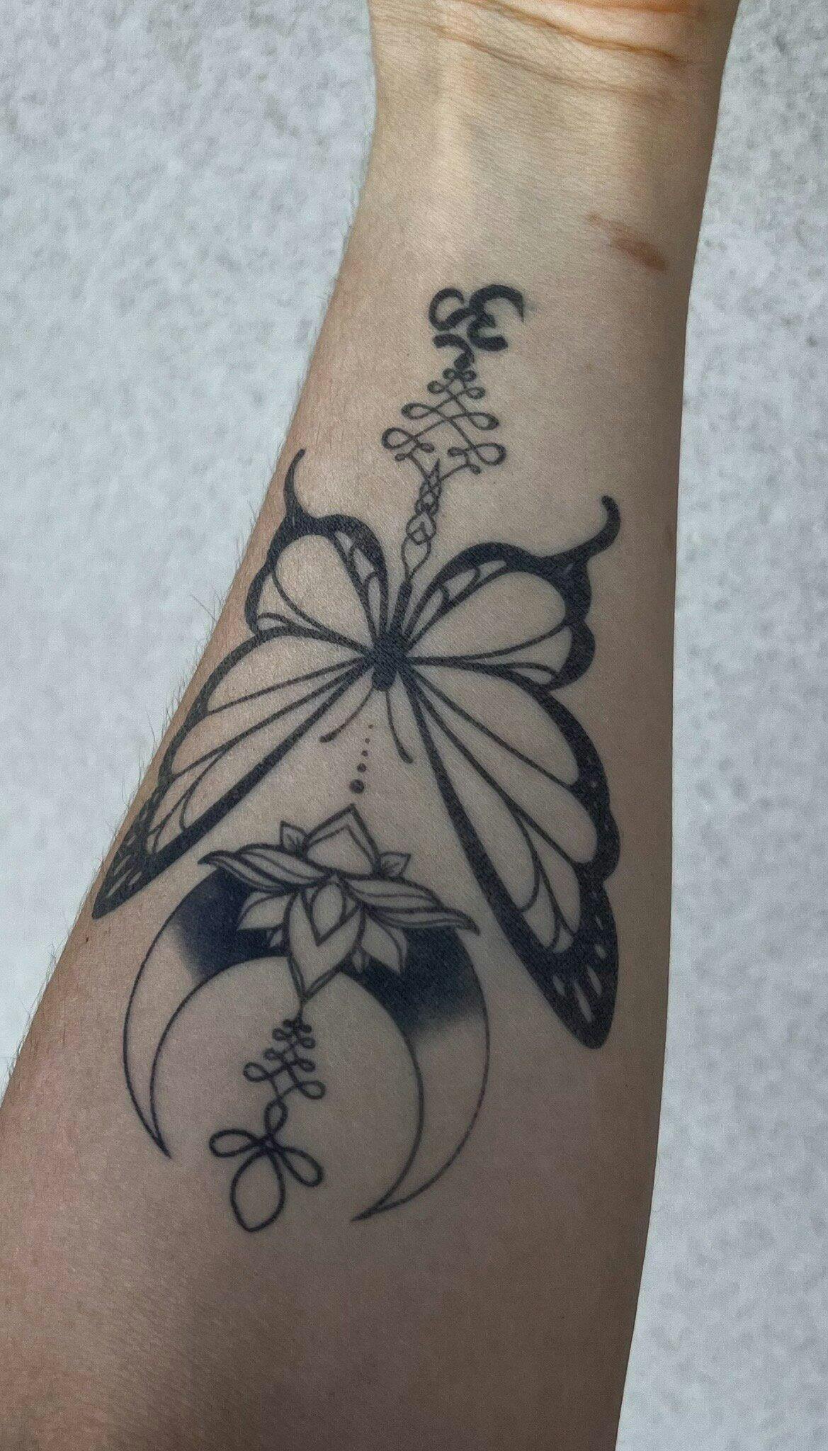 The Omkara Butterfly tattoo fuses two powerful symbols: the Om̐ (ॐ), the sacred syllable of Hindu spirituality, and the butterfly, messenger of transformation, freedom and lightness.